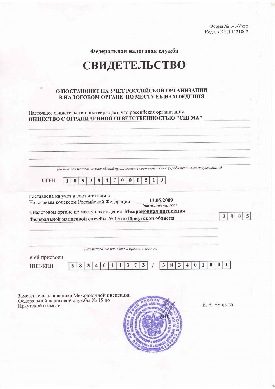 Индивидуальный номер налогоплательщика общества с ограниченно ответственностью "Сигма". ИНН ООО "Сигма"